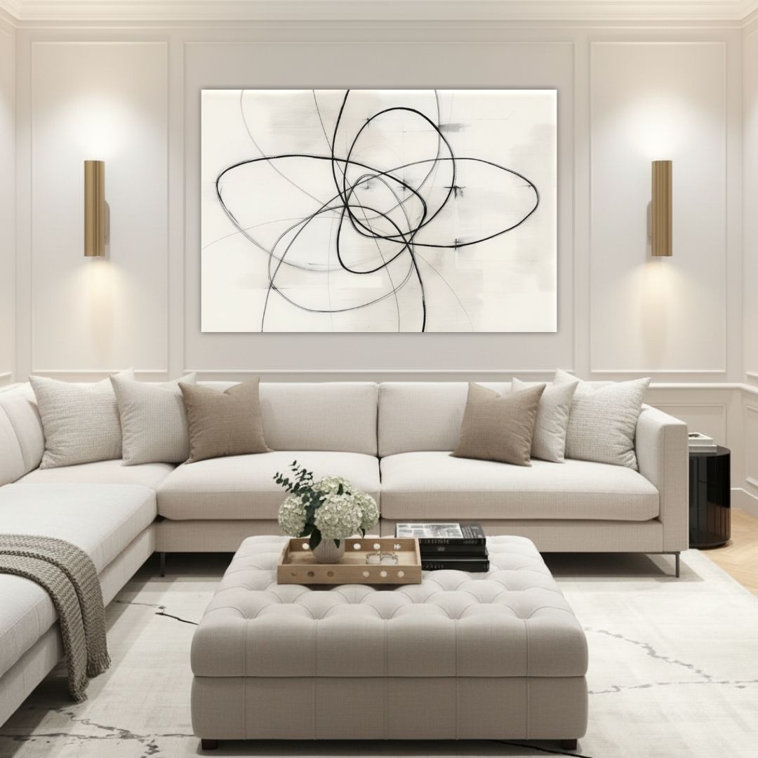 Printed on canvas and made in Canada, this artwork brings a sense of calm through contrast. The fluid, abstract lines reflect the tension of control, while the open space invites stillness and release. Designed for modern, minimalist, and refined interiors, it grounds the room with quiet movement and a deeper sense of surrender that lingers.