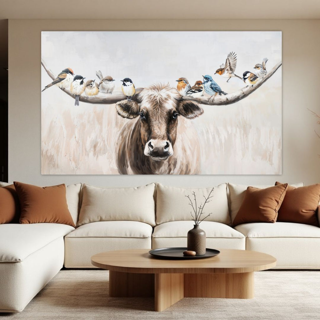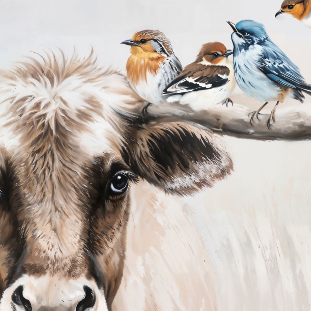 Beyond its visual beauty, this piece tells a deeper story, of how even the strong can carry peace, and how life’s gentlest moments often perch upon the quietest shoulders. The cow, a symbol of patience and nurturing energy, stands gracefully as a vessel of tranquility, while the birds bring a whisper of freedom and lightness, a reminder that where peace chooses to land, beauty follows.
