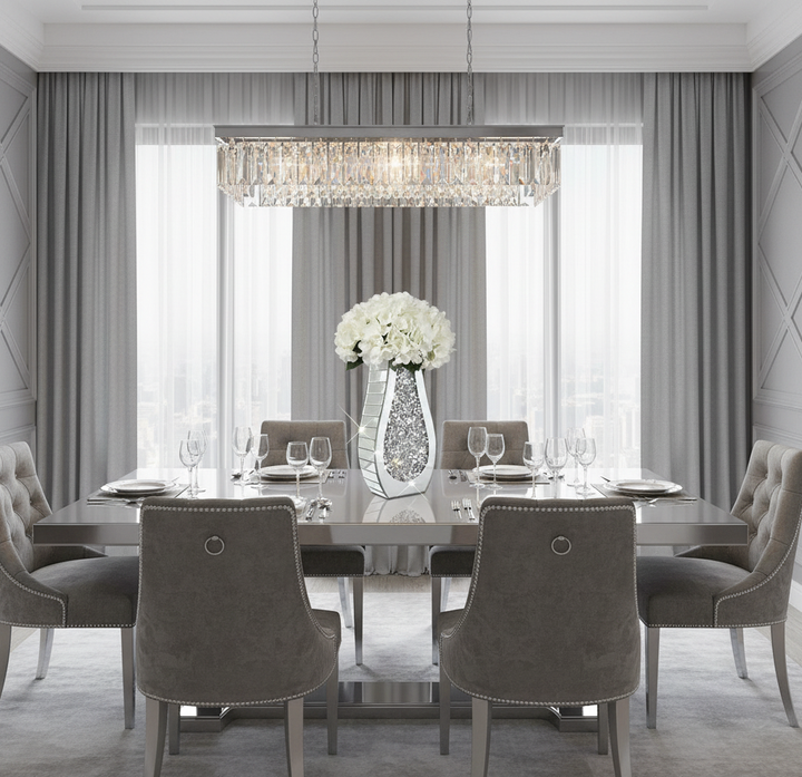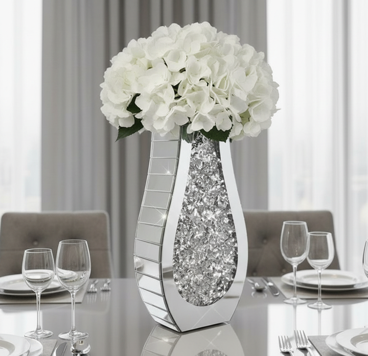 Our stunning 15" mirrored vase with crystals, is a masterpiece that effortlessly combines elegance and opulence. This exquisite vase features a mirrored & crystal surface that reflects light and adds a touch of glamour to any space. At 15" in height, it stands tall as a captivating centerpiece or a statement accent piece. The addition of a sparkling crystal further enhances its allure, creating a dazzling focal point that catches the eye. This mirrored vase is the perfect choice to showcase your favorite flowers or display it as a standalone decorative piece. Its reflective surface beautifully complements any floral arrangement, enhancing its visual impact. With its impeccable craftsmanship and luxurious design, this vase is an ideal addition to any home decor, event, or special occasion. Let it become the shining star of your interior design, effortlessly adding a touch of sophistication and sparkle to your space.
